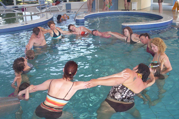 A program zanzásítva: kora reggel és késő délután jógázás különböző stílusokban, fakultatív vízi-jóga, filmvetítés, éneklés. Abban a kevés időben, ami a programok mellett maradt a napból, leginkább a medence partján (vagy benne) ejtőztünk, és jókat beszélgettünk.