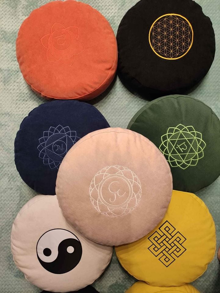 Csakra mandalával hímzett, tönköly pelyvával töltött, dupla huzatú, kerek (35 cm 8 cm magas) ülőpárna.